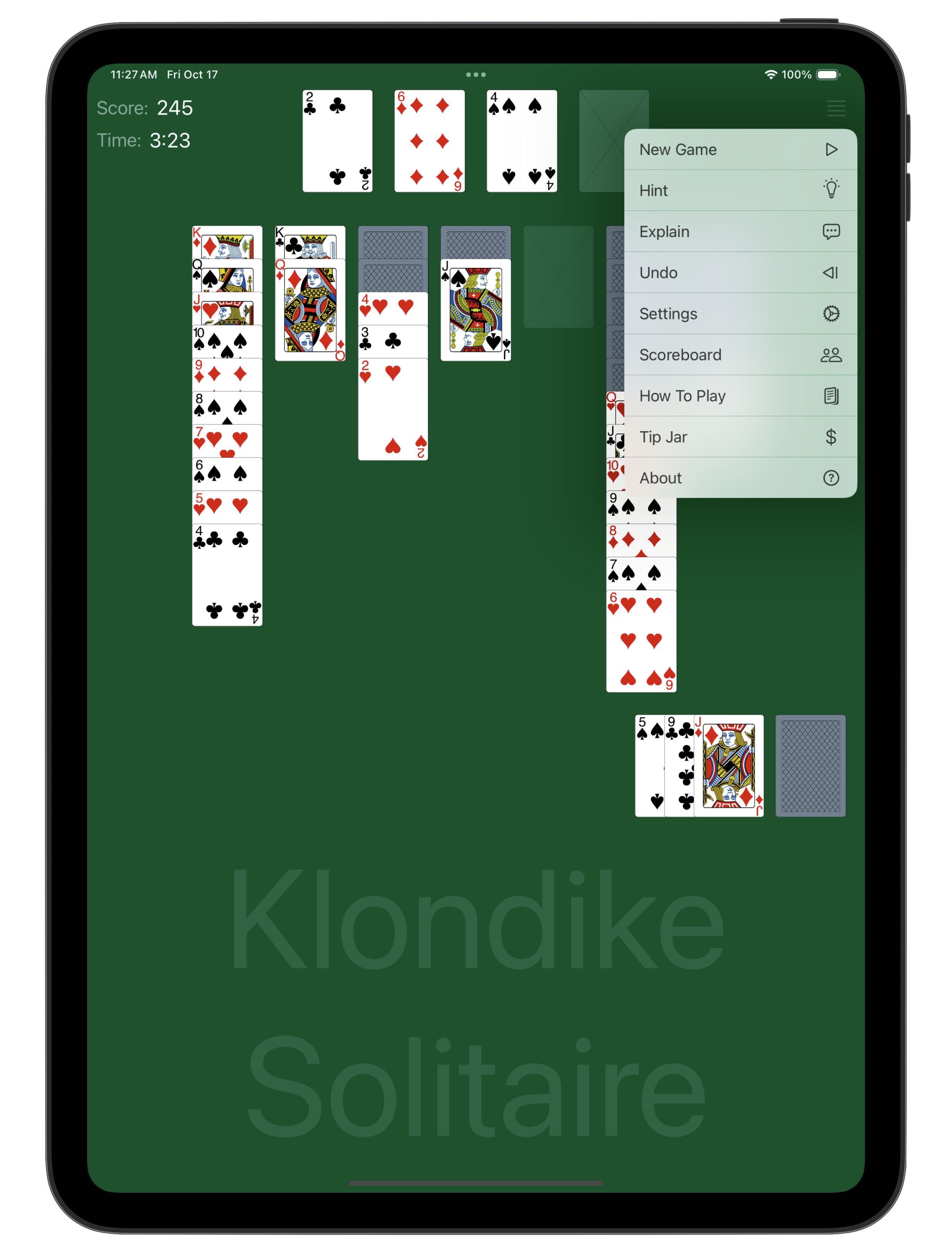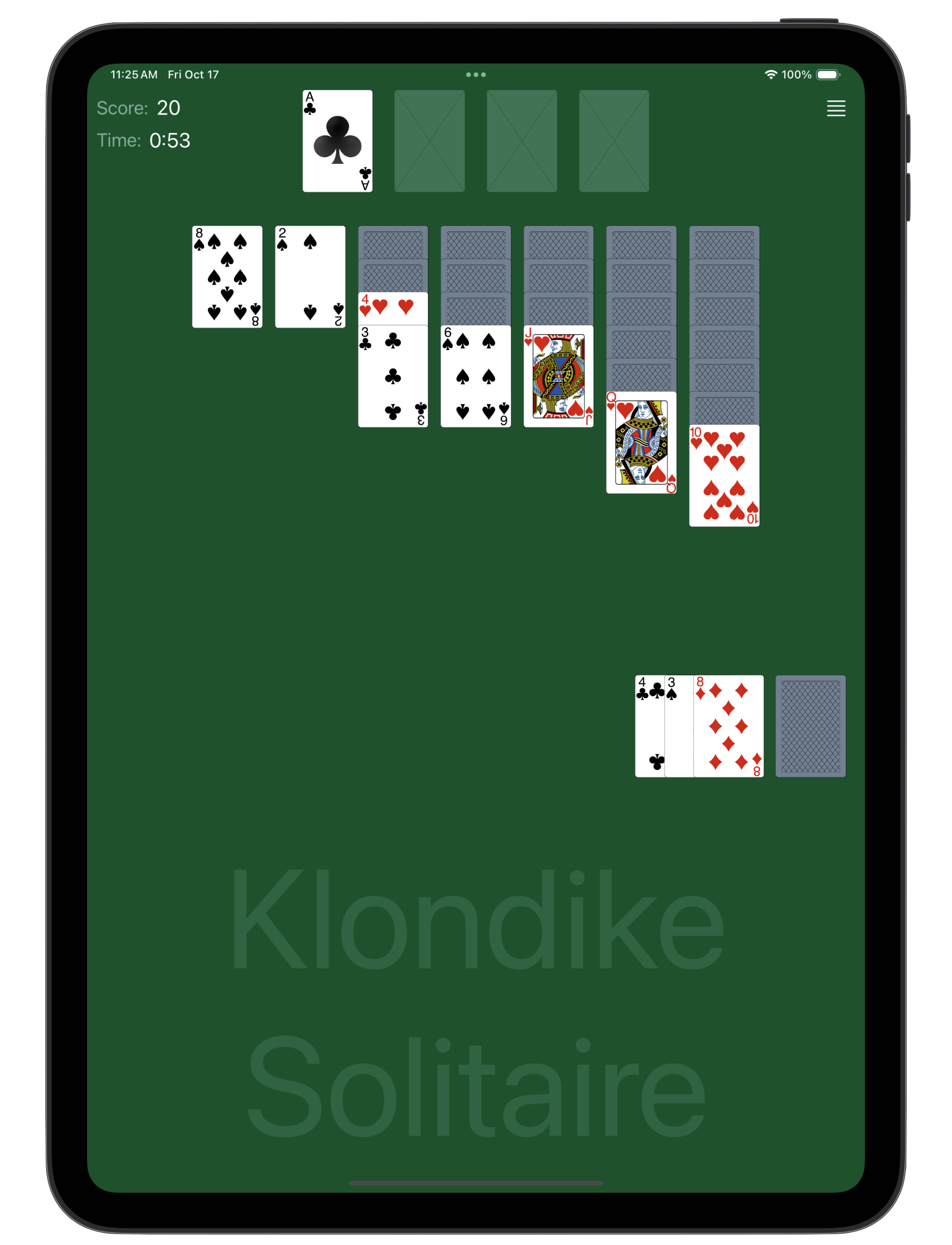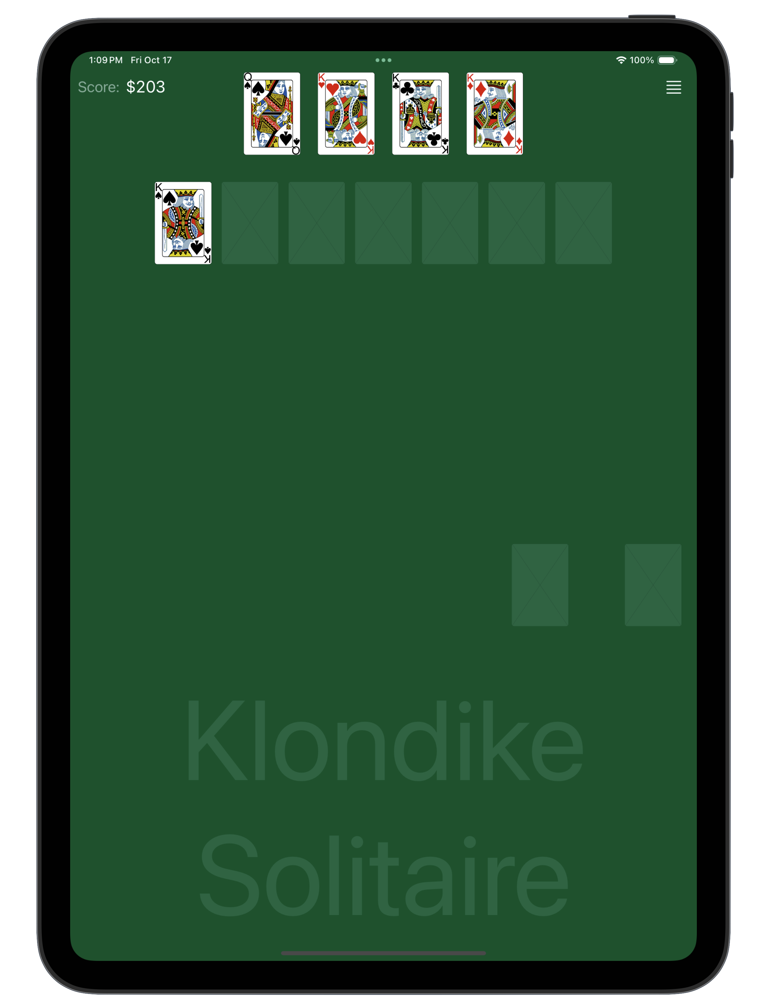 The remaining cards form the stock are placed facedown at the upper left of the screen. The four foundations (light rectangles in the upper right of the screen) are built up by suit from Ace to King, and the tableau piles can be built down by alternate colors. Every face-up card in a partial pile, or a complete pile, can be moved, as a unit, to another tableau pile on the basis of its highest card. Any empty piles can be filled with a King, or a pile of cards with a King.