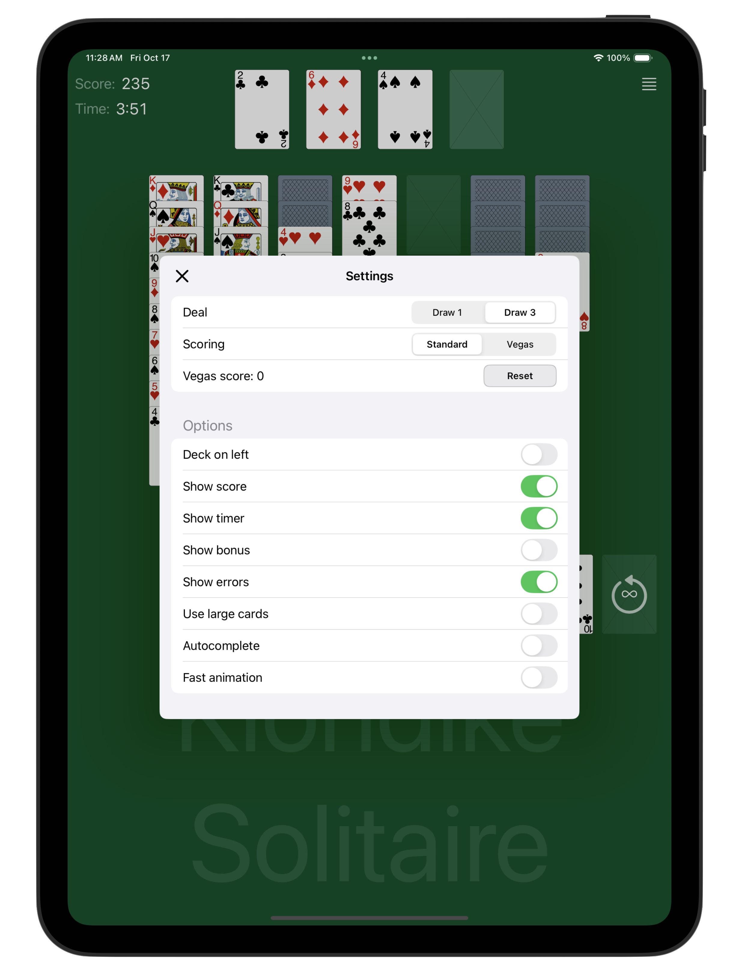 There are following ways of dealing the remainder of the deck from the stock to the waste, selectable from the Settings view: