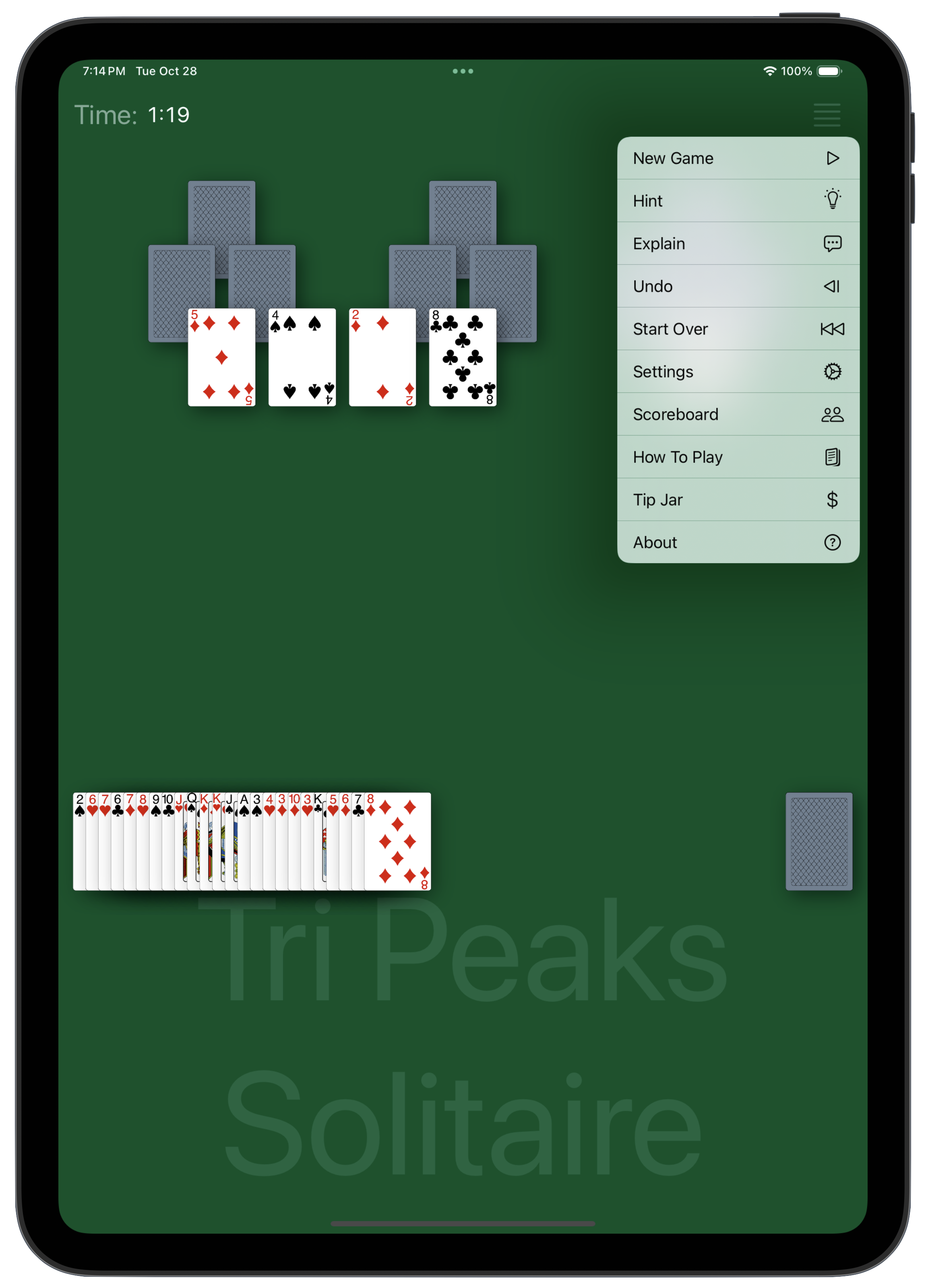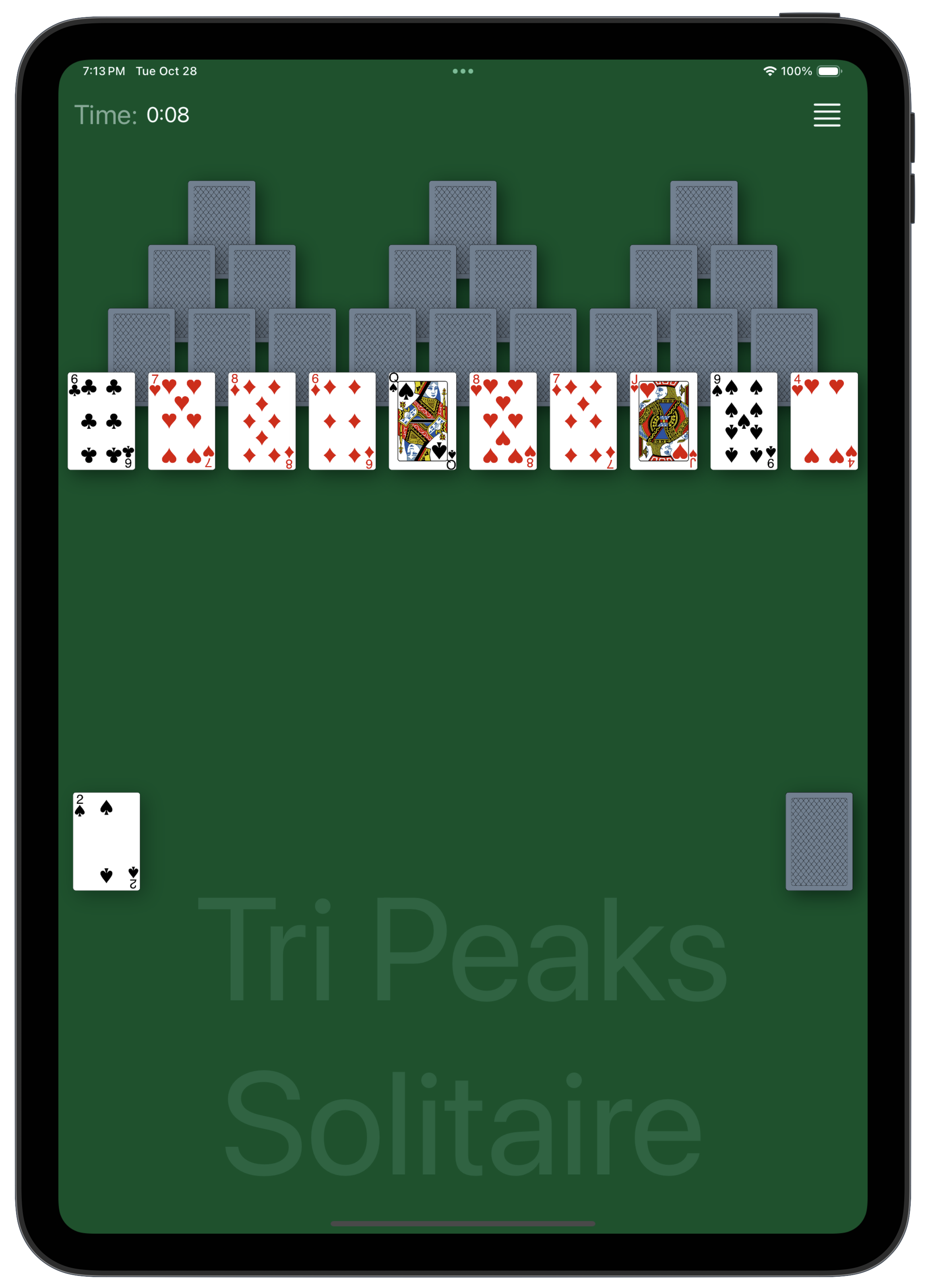 The game starts with eighteen cards dealt face-down on the tableau to form three face-down “pyramids” of six cards each, and a row of ten cards beneath.